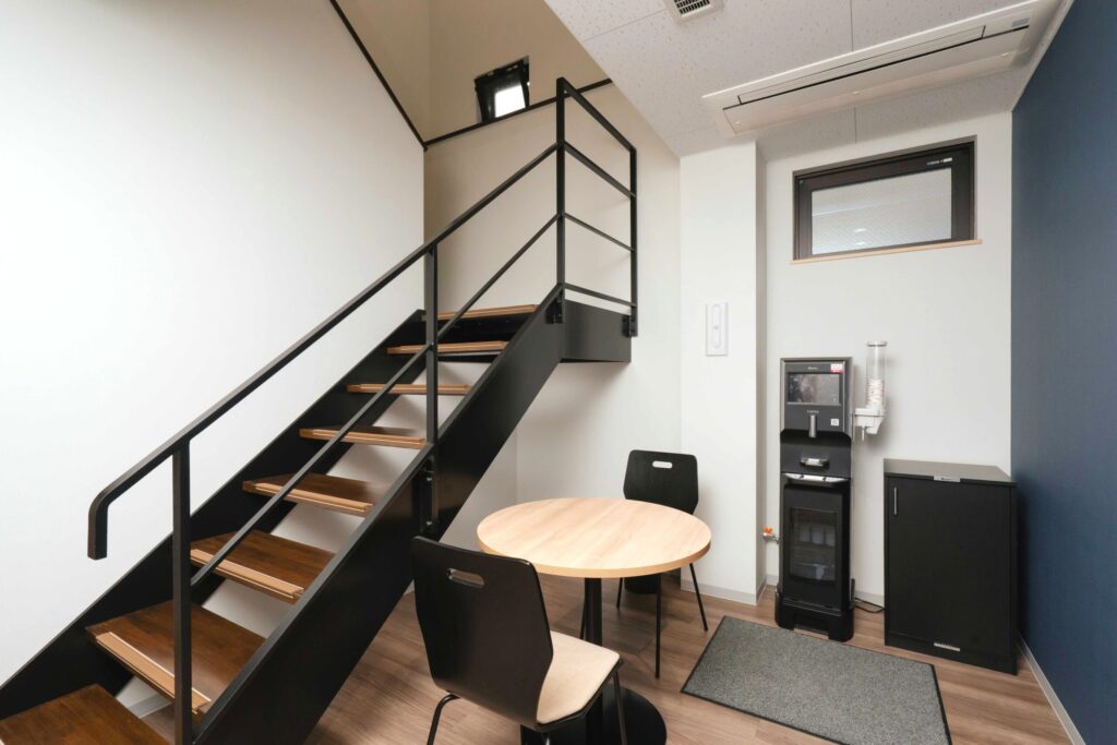 エスプレッソマシン・冷蔵庫・オーブンレンジなどの設備のほか、窓際にはカウンター席があり、リフレッシュできる空間になっています。休憩時間や気分を切り替えたいときに利用されています。